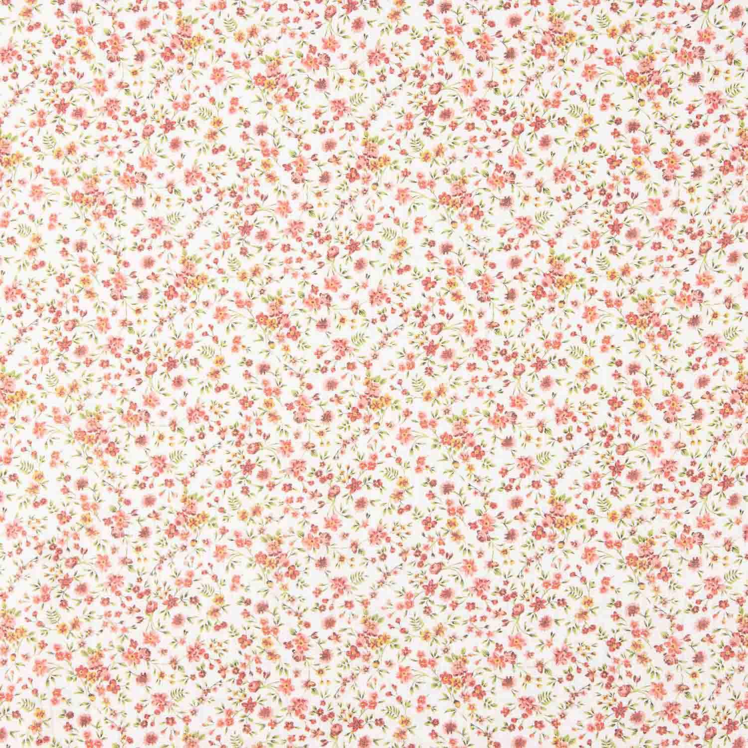 Tela de muselina de algodón 100 % con delicado estampado de pequeñas flores en tonos rosados sobre fondo blanco.