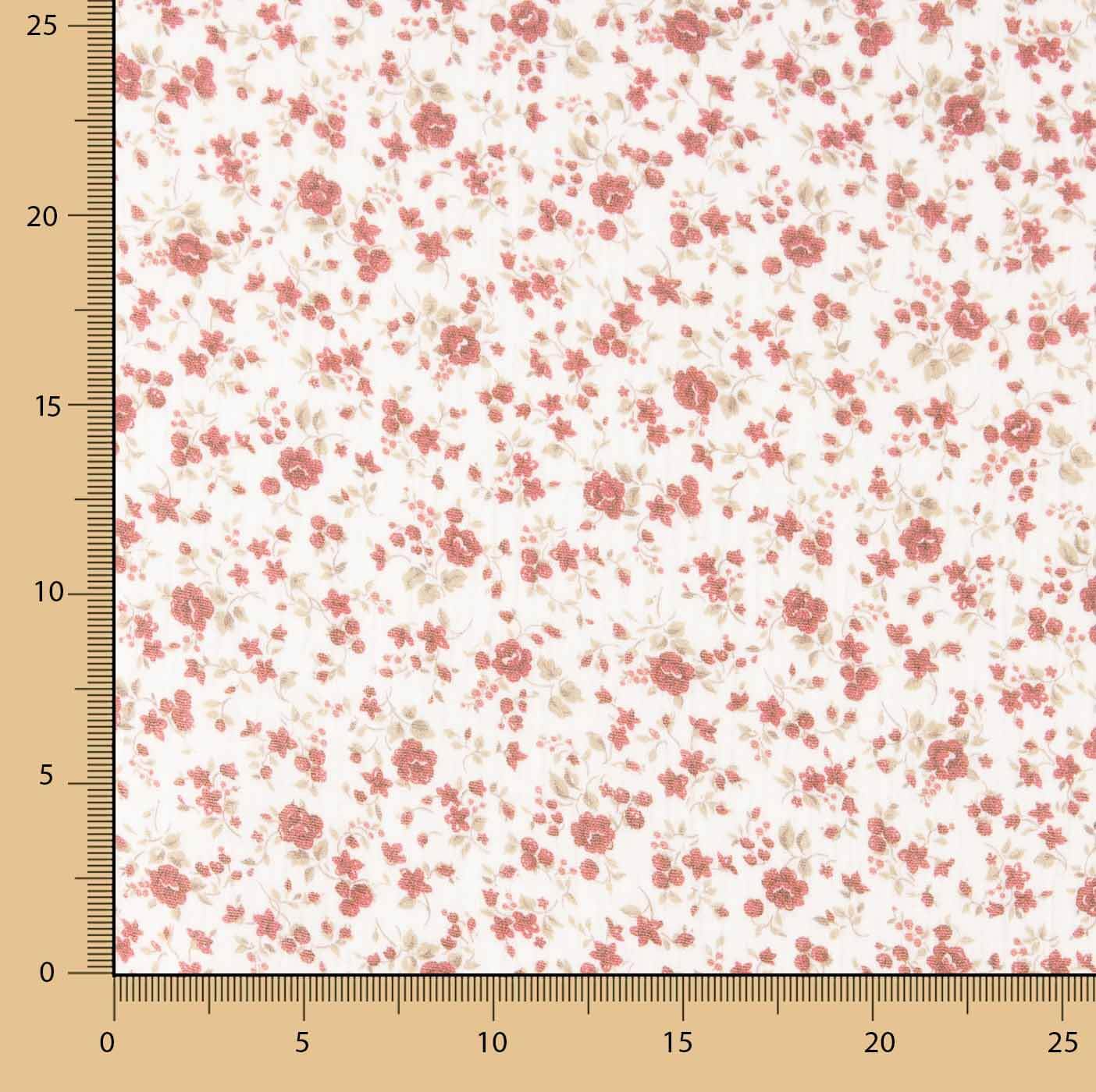Tela de muselina de algodón 100 % con estampado floral en tonos rosados y beige sobre fondo blanco.