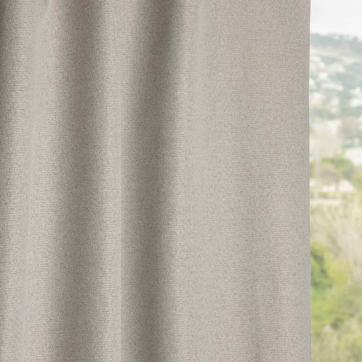 Tela black out total estilo rústico beige. Tejido oscurante para cortinas ignífugas. El black out es una tela para cortinas muy opaca, gruesa y caída, con acabado simulando falso liso. Ofrece un poder oscurante del 99% de opacidad, ideal para ensombrecer estancias evitando la entrada directa del sol.