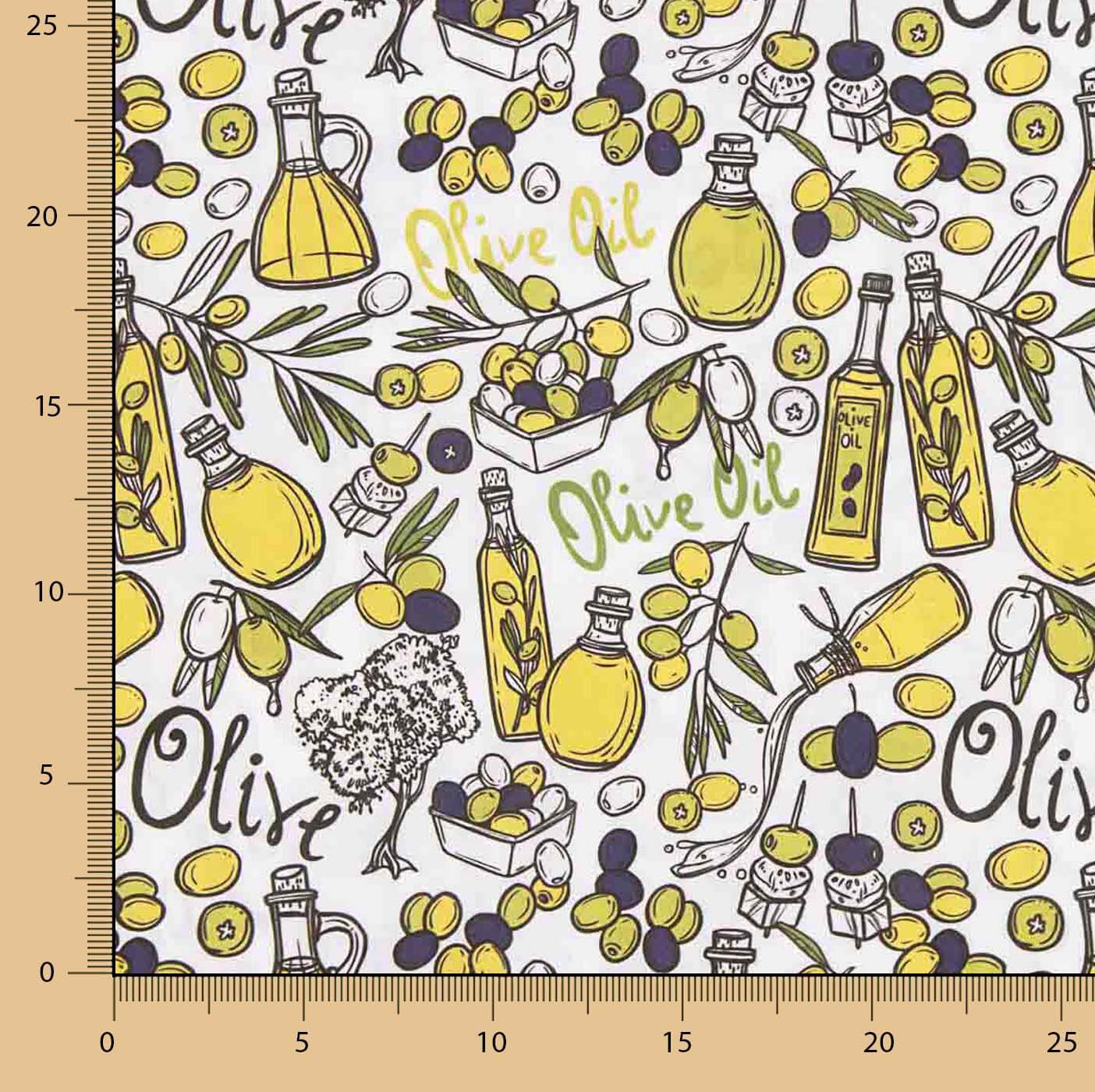 Este popelín de algodón 100%, con ancho de 150 cm, presenta un estampado gastronómico de botellas de aceite, aceitunas y ramas de olivo sobre fondo blanco. Ideal para proyectos de cocina, delantales, manteles, bolsas o decoración con temática mediterránea. Es una tela suave, fácil de coser y con mucho encanto rústico.
