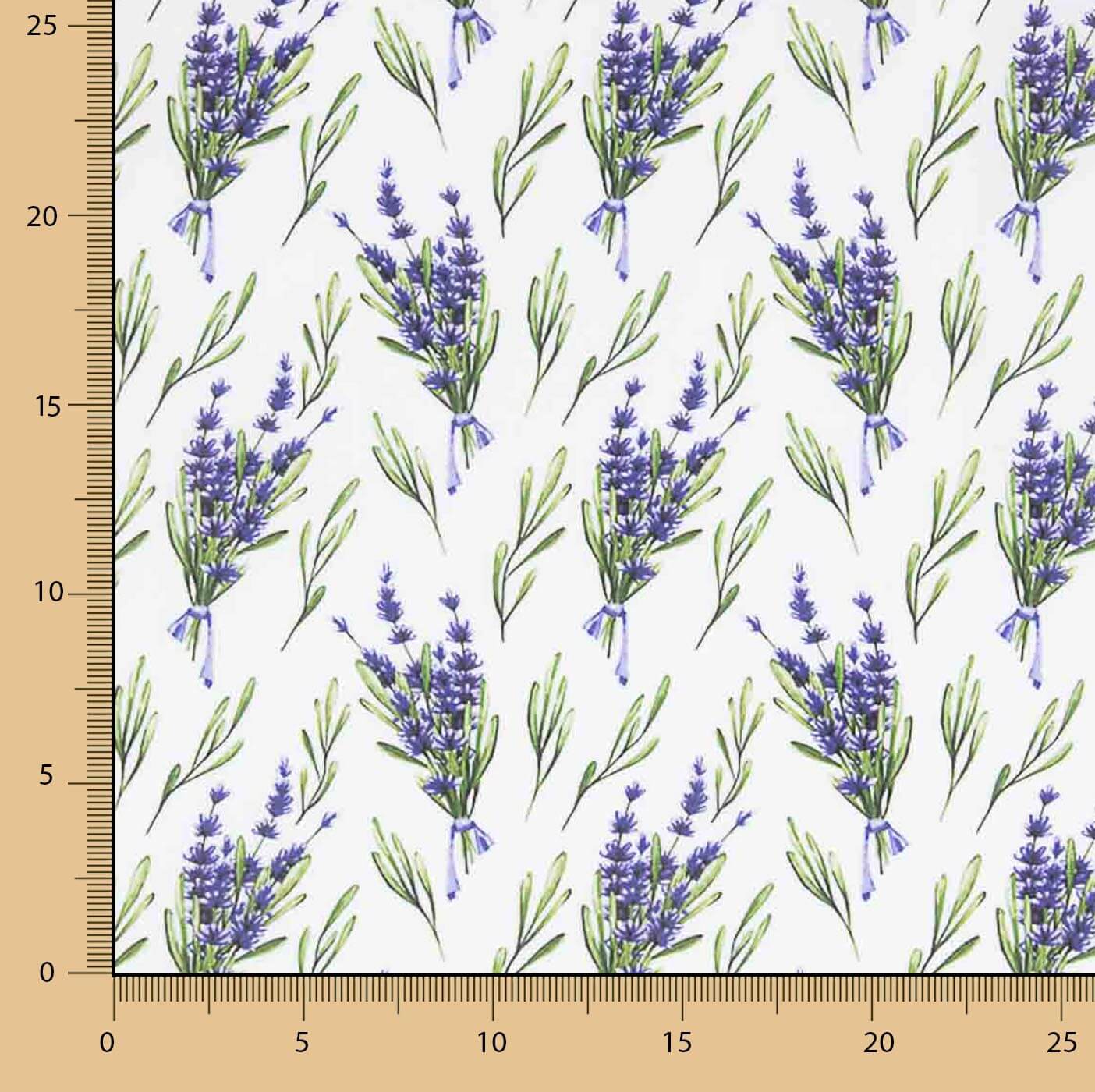 Popelín de algodón con un delicado estampado de ramilletes de lavanda en tonos morados y verdes sobre fondo blanco. Ancho: 150 cm. Composición: 100% algodón. Ideal para confección de camisas, vestidos, ropa infantil, accesorios, patchwork o decoración del hogar.