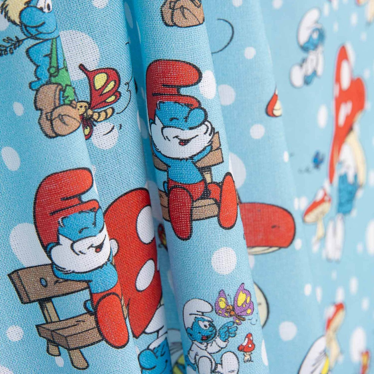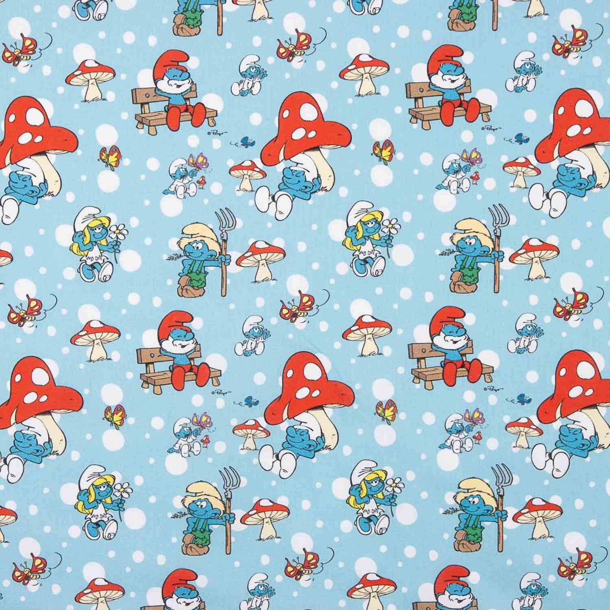 Tela de popelín estilo cretona 100% algodón con estampado digital infantil de Los Pitufos en un fondo azul celeste decorado con setas rojas, mariposas y detalles de la naturaleza.