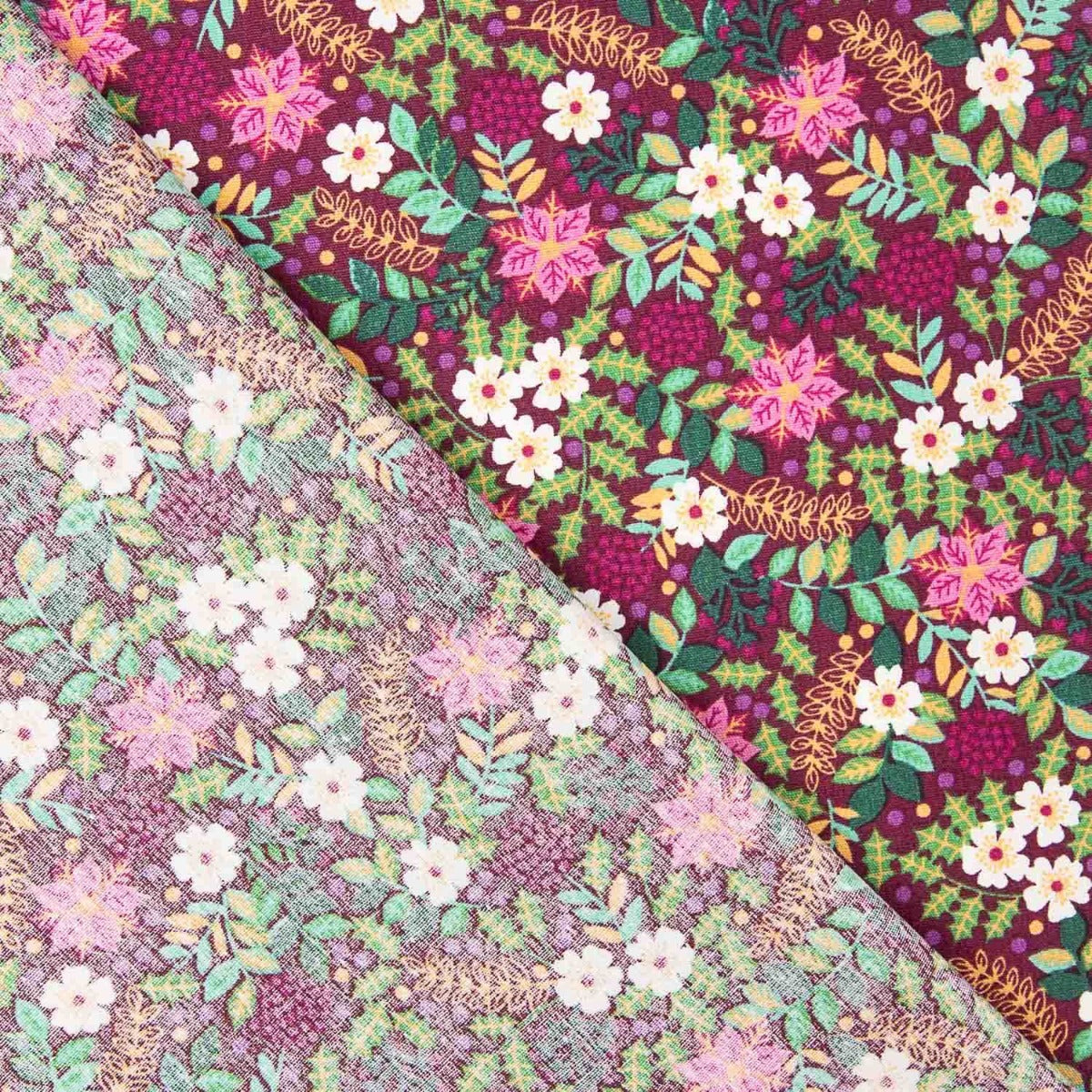 Aporta calidez y encanto a tus creaciones con la tela de popelín de algodón Jardín Silvestre Burdeos, un estampado floral lleno de vida en tonos rosa, verde y blanco sobre fondo burdeos intenso, que aporta profundidad y elegancia a cualquier prenda o accesorio.
