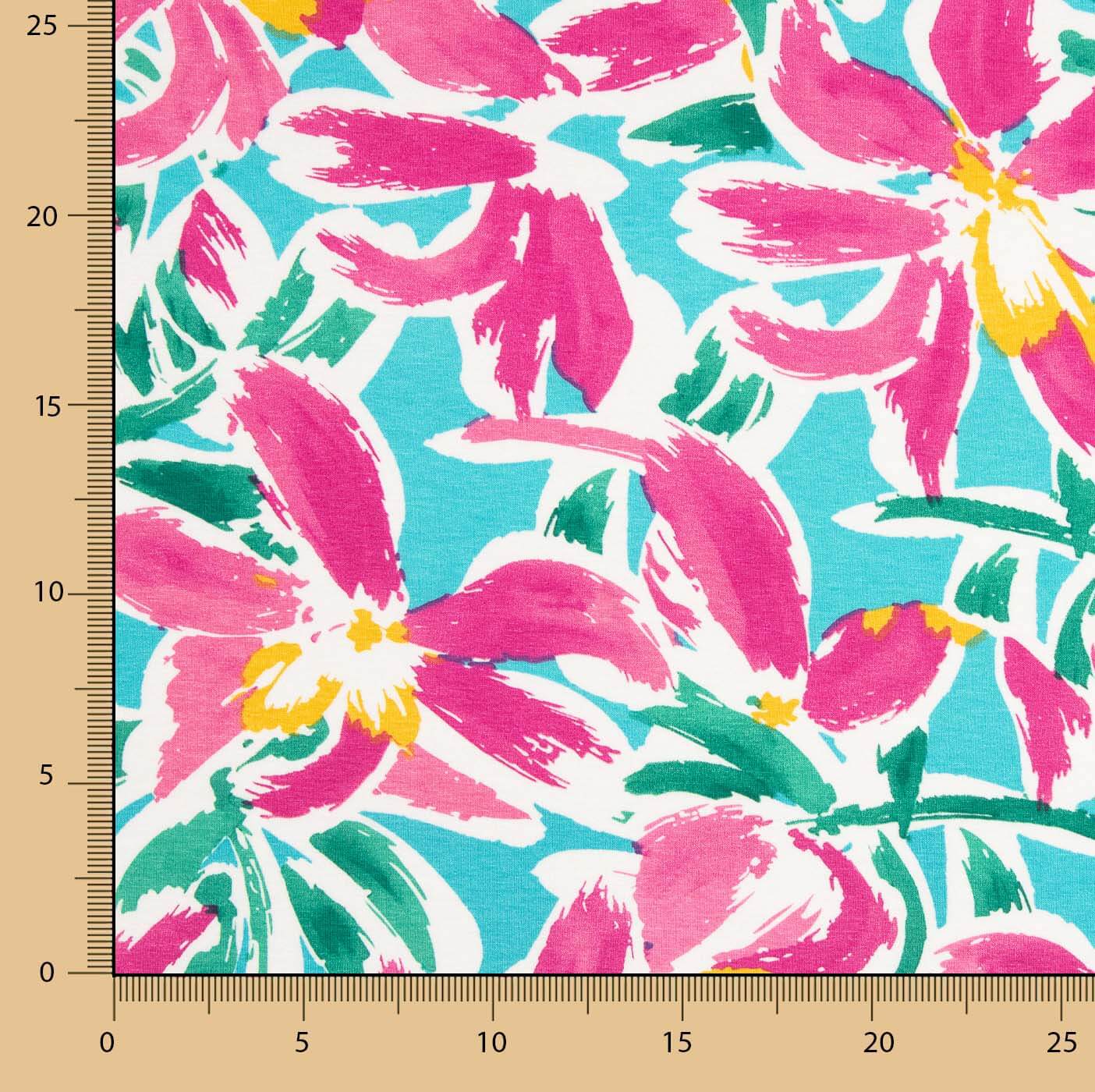 Llena tus creaciones de color y movimiento con esta tela de punto viscosa Floral Tropical Turquesa, un jersey estampado de inspiración exótica con grandes flores en tonos fucsia, verde y amarillo sobre un vibrante fondo turquesa. Su composición de 95% viscosa y 5% elastano proporciona una textura extremadamente suave, fresca y elástica, con una caída fluida que realza la silueta y aporta comodidad en cada movimiento. Con un ancho de 145 cm, es ideal para confeccionar vestidos ligeros, camisetas, faldas, monos o prendas veraniegas que buscan un acabado femenino y desenfadado. Una tela transpirable, agradable al tacto y perfecta para diseños llenos de personalidad y estilo.