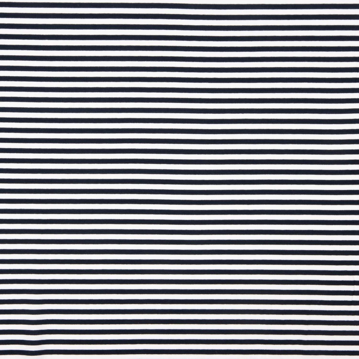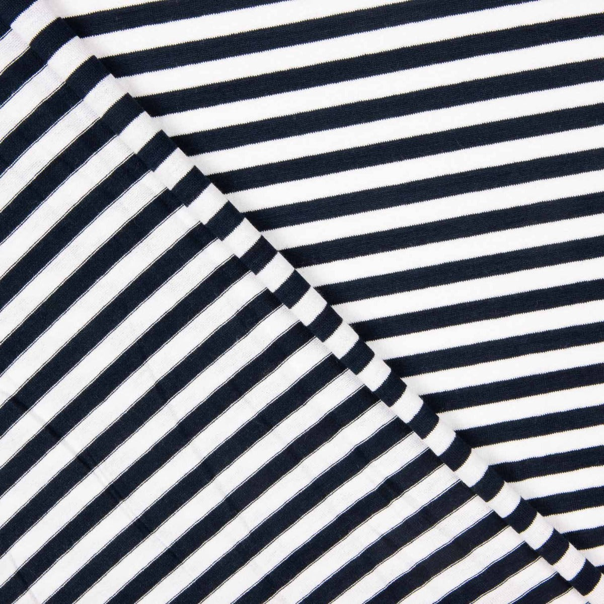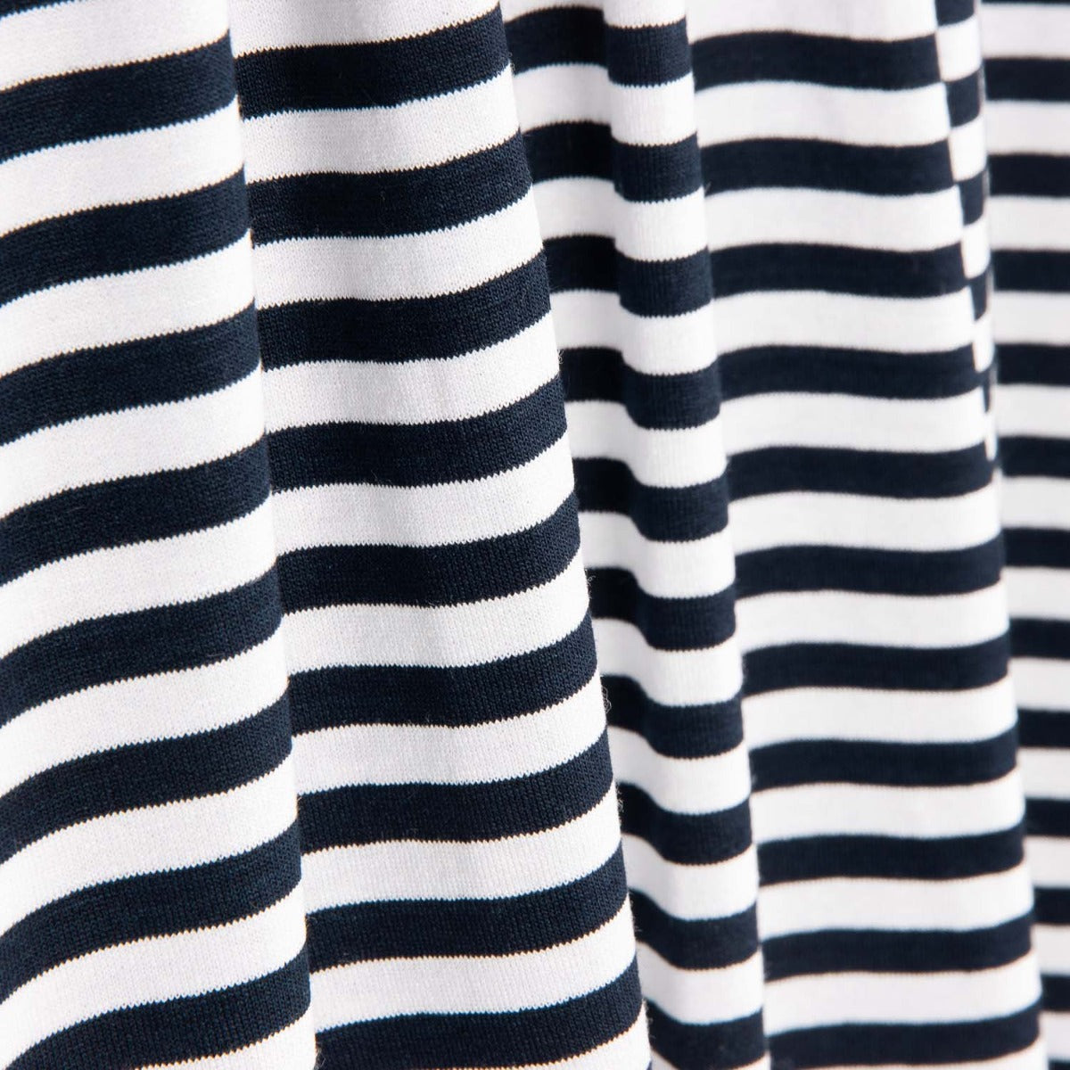 Este tejido de punto de viscosa con rayas azul marino y blanco es un clásico atemporal ideal para prendas cómodas y con estilo.