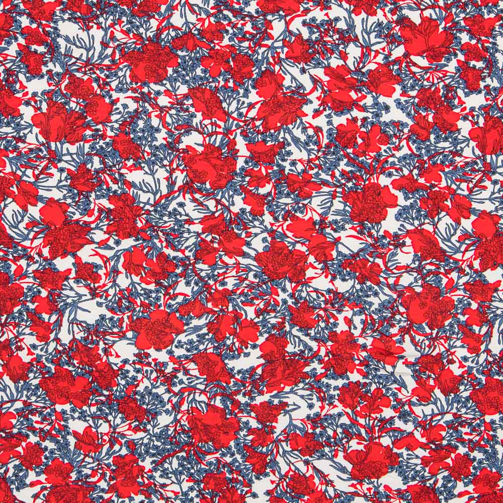 Punto elástico con estampado floral combinado con moteado rojo sobre fondo blanco roto. Punto de viscosa con caída, muy ligera y fluida, de textura suave y fresca. Contiene un porcentaje de elastano que proporciona mayor comodidad y confort a las prendas. Punto para confeccionar camisetas, vestidos, faldas y pantalones, así como todo tipo de prendas ajustadas. No es necesario utilizar ningún tipo de forro, no transparenta. Al ser una tela de viscosa, aconsejamos un lavado previo antes de ser manipulado.