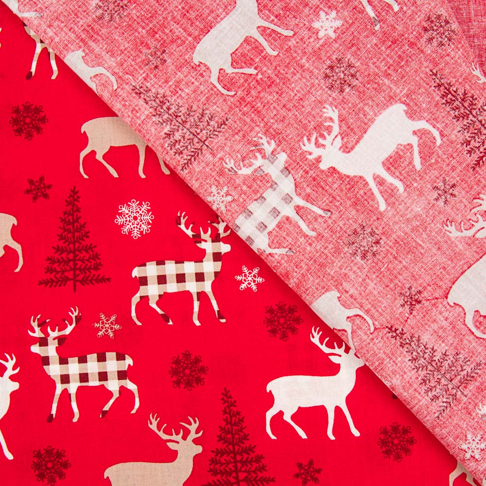 Retal de tela de navidad estampada con renos sobre fondo rojo. El popelín es una tela de algodón muy versátil, suave, fina y sostenida. Tela de algodón ideal para decoración de navidad, manteles y patchwork.
