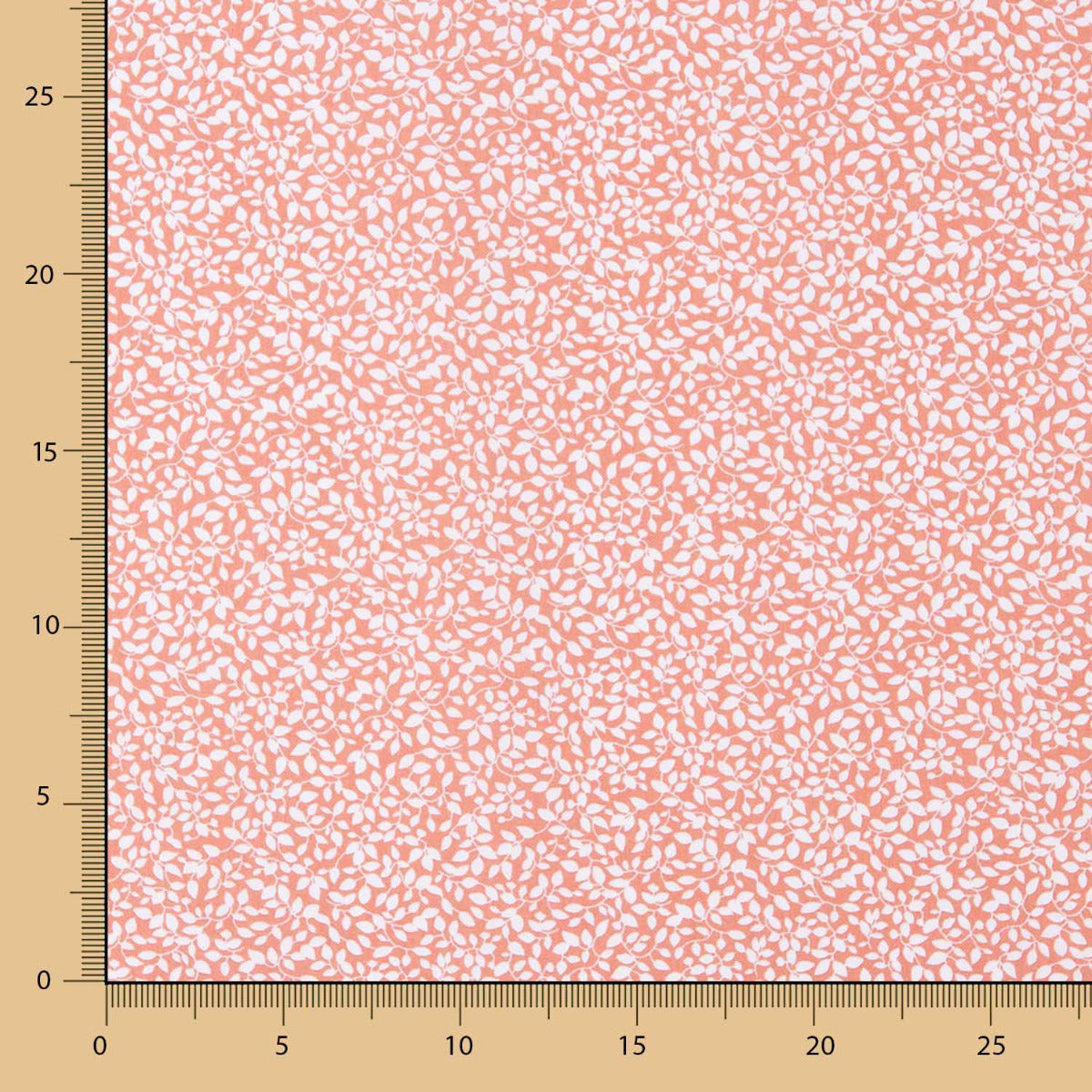Tela de algodón orgánico con estampado de dibujo de ramas en blanco sobre un tono papaya.