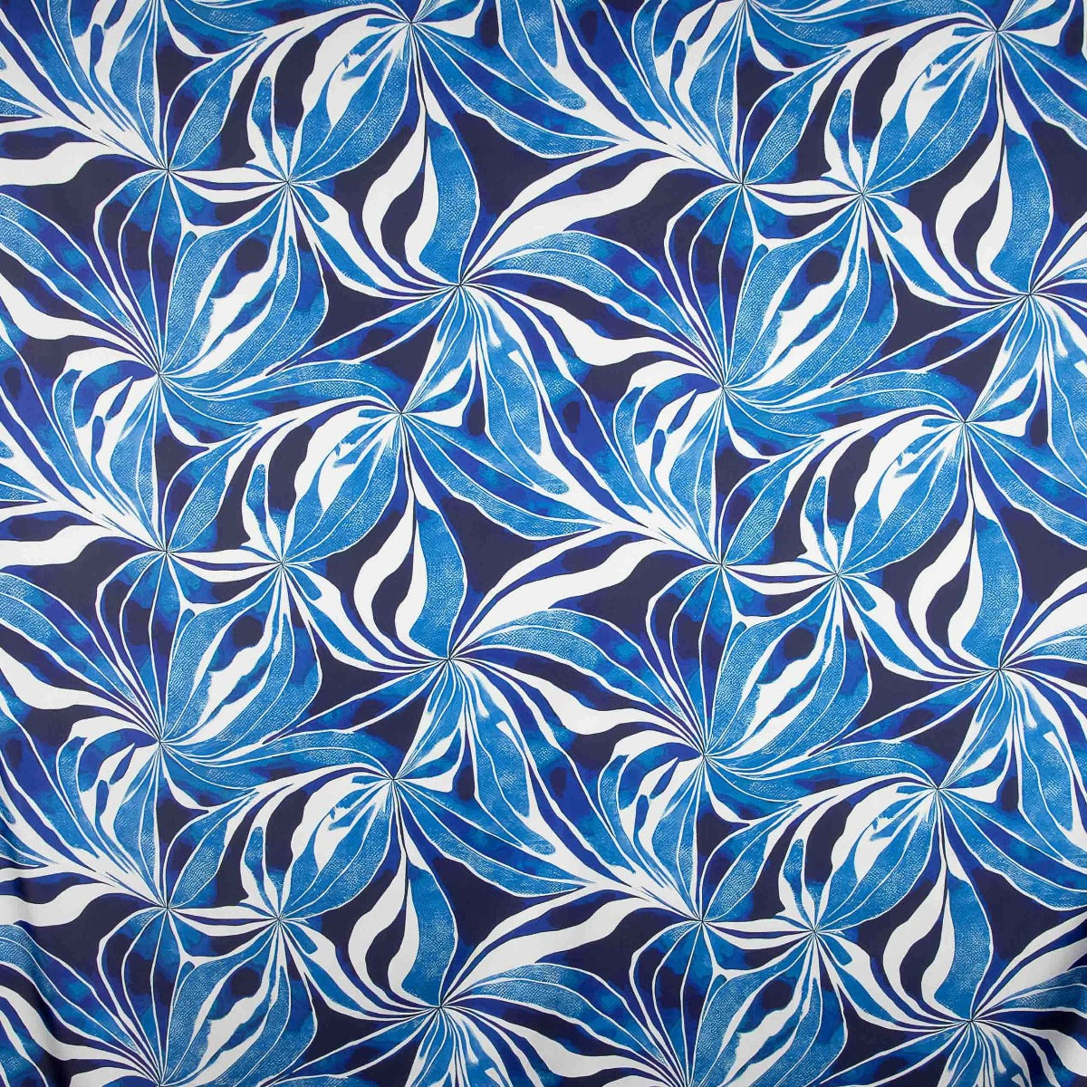 Tela de satén de tacto sedoso y con mucha caída de un estampado a trazos azules y blancos.