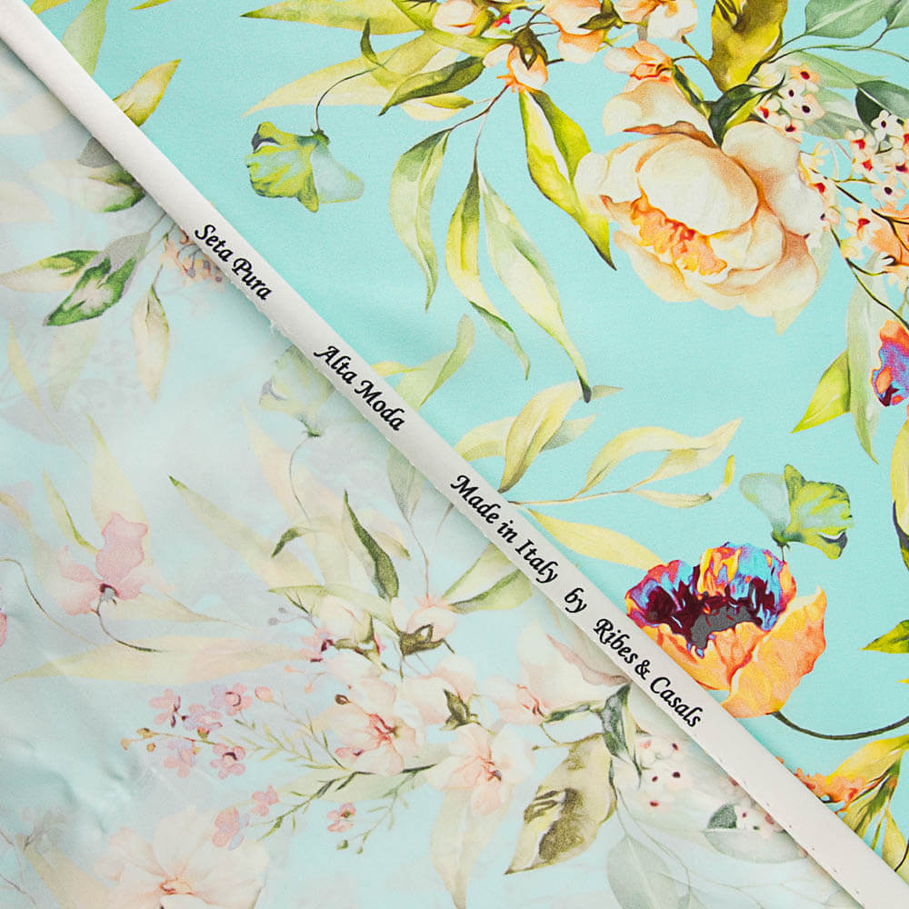 La tela de satén de seda natural con estampado exclusivo de Ribes y Casals ofrece una experiencia de alta costura con su combinación de lujo y exclusividad.