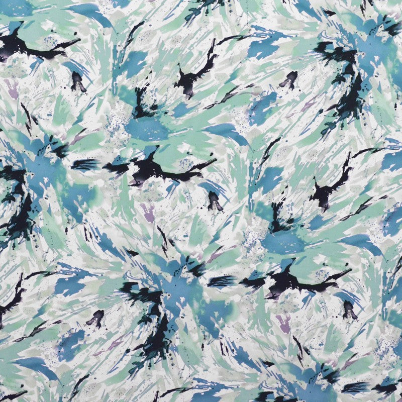 Tela de crepe con estampado con machas en tonalidades verdes, negro y beige sobre un fondo blanco roto. Crepe opaca, con mucho vuelo y caida, textura rugosa al tacto que recuerda al Crespón y al Koshibo pero de una calidad superior. Tela ideal para la confección de trajes de flamenca, blusas, vestidos y faldas.