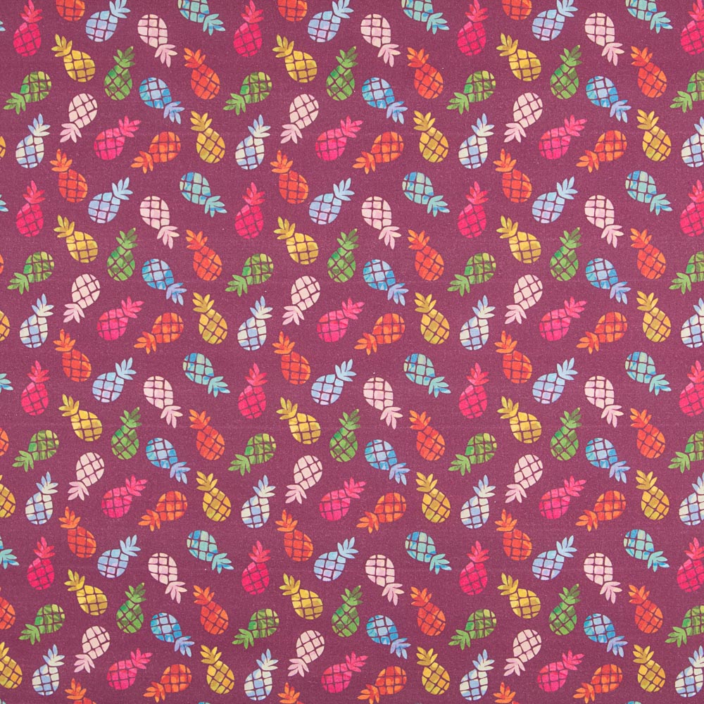 Tela estampada de piñas sobre fondo granate. El popelín es una tela de algodón muy versátil, suave, fina y sostenida. Tela de algodón ideal para accesorios, decoración del hogar, patchwork e incluso mascarillas.