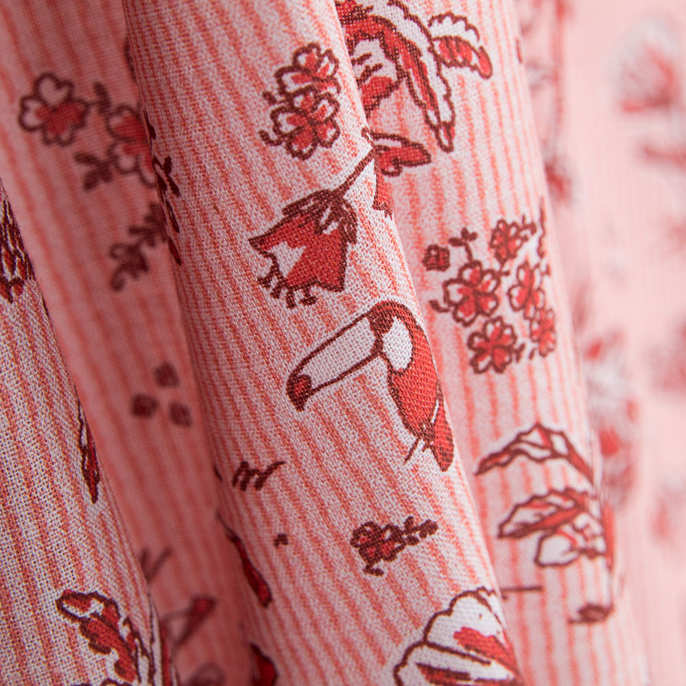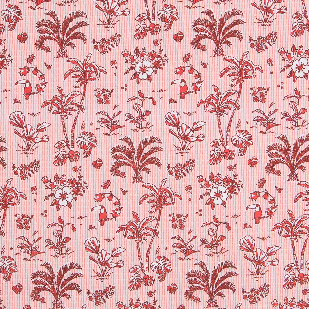 Tela estampada tropical con rayas vichy coral de gran calidad. El popelín es una tela de algodón muy versátil, suave, fina y sostenida. Tela de algodón ideal para accesorios, decoración del hogar, patchwork e incluso mascarillas.