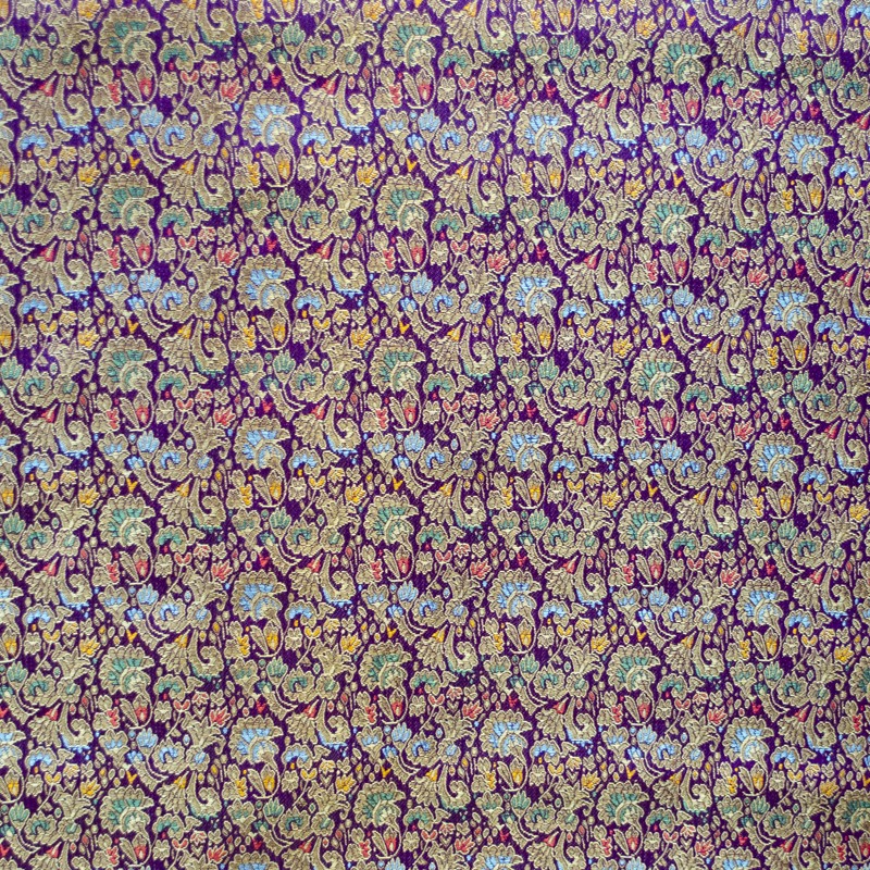 Tela fantasía de raso con dibujo liberty sobre un fondo morado. Tela de efecto satinado,opaca, sostenida y fina, de textura de muy suave. Tela online con dibujo fantasía estilo oriental, ideal para disfraces, monederos y bolsos y todo tipo de manualidades.