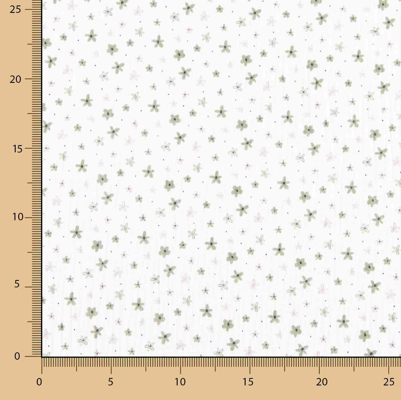 Tela de muselina (bambula) 100% algodón de 140 cm de ancho con delicado estampado de pequeñas margaritas en tonos kaki, verde oliva y detalles suaves sobre fondo claro, creando un diseño natural, dulce y atemporal ideal para confección infantil y de bebé.