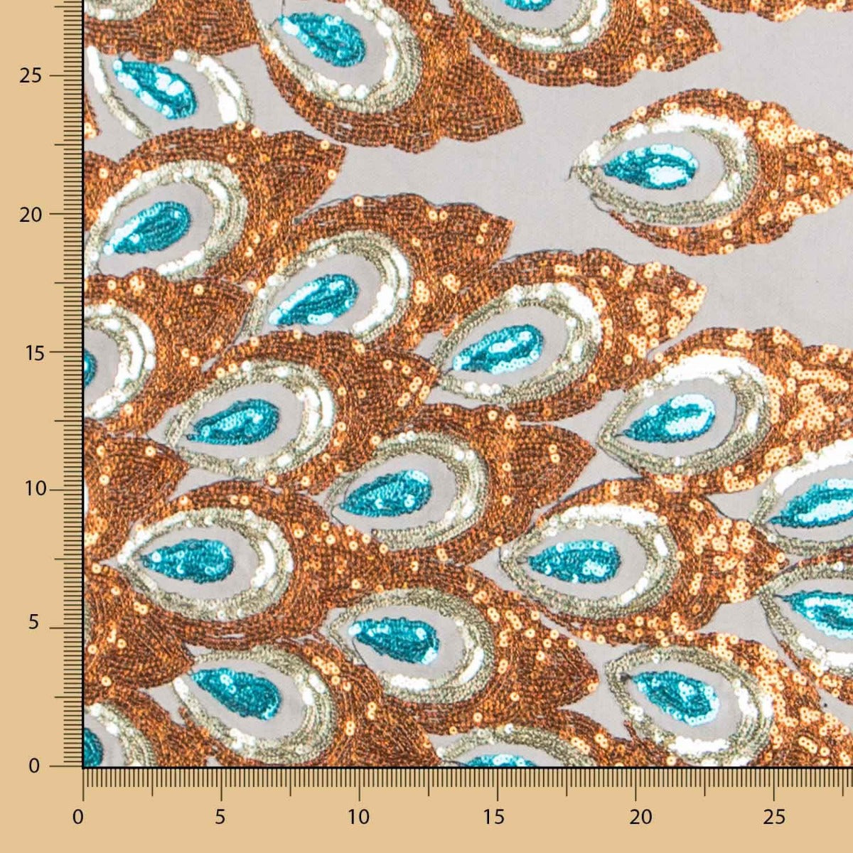 Tela de lentejuela con dibujo de plumas pavo real en naranja. Tela de lentejuela sobre una base de tul con colores llamativos y muy luminosos.