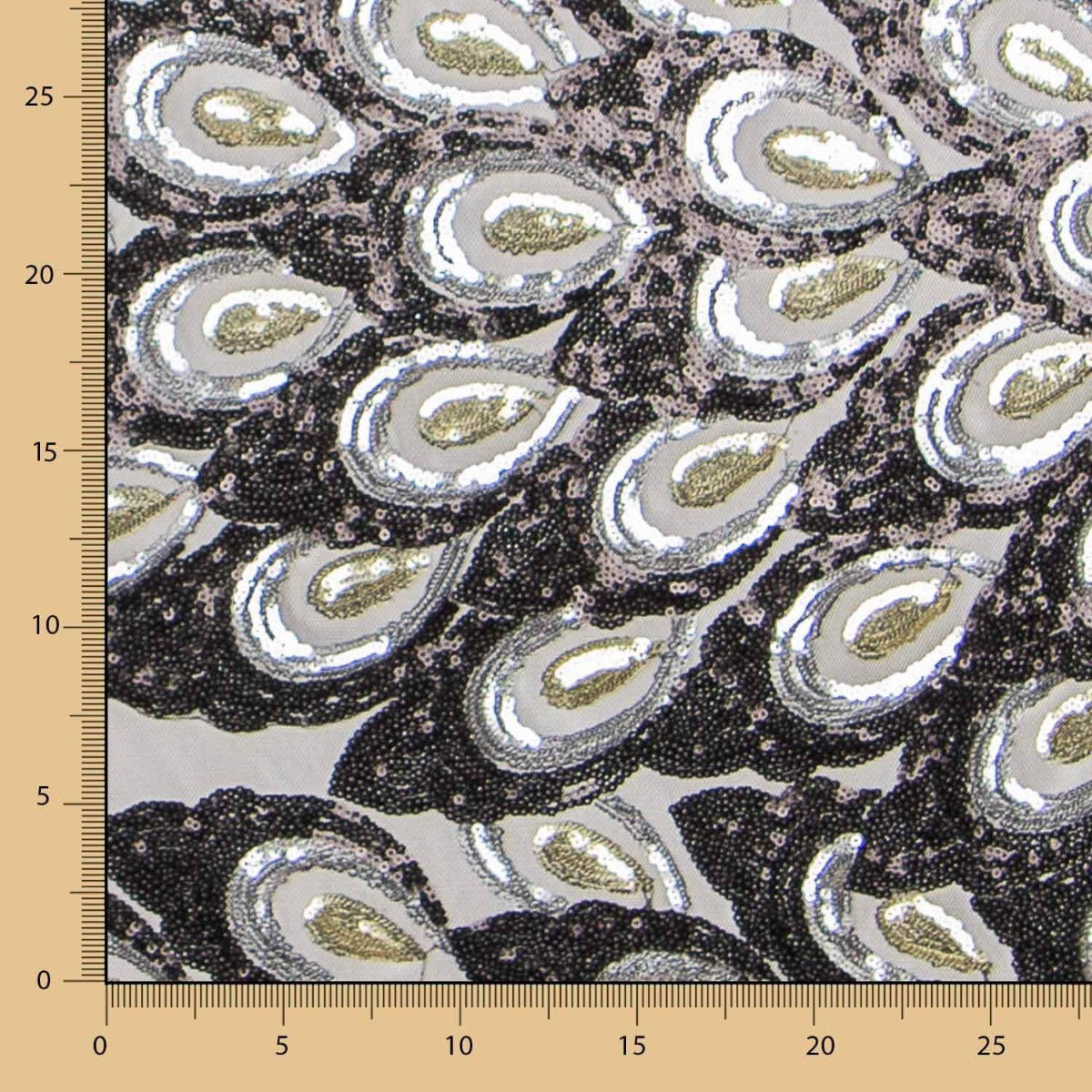 Tela de lentejuela con dibujo de plumas pavo real en negro. Tela de lentejuela sobre una base de tul con colores llamativos y muy luminosos.