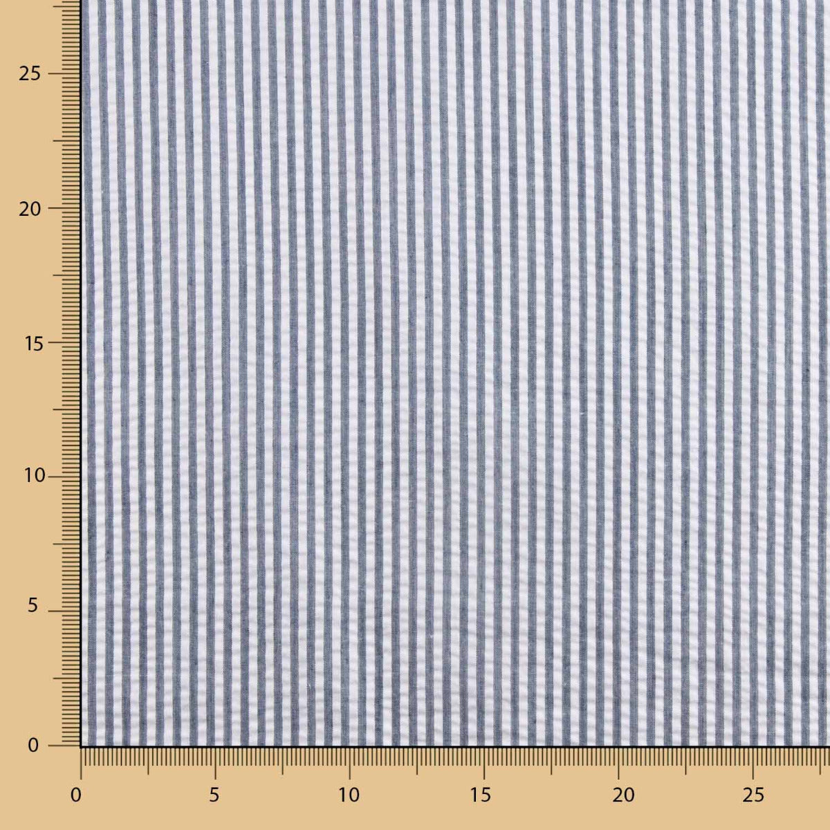 Tela Vichy Sersuker Rayas Marino. Tela de Poliéster/algodón con estampado vichy de rayas en color azul marino. La tela sersuker tiene una textura inconfundible que aporta un efecto arrugado muy característico.