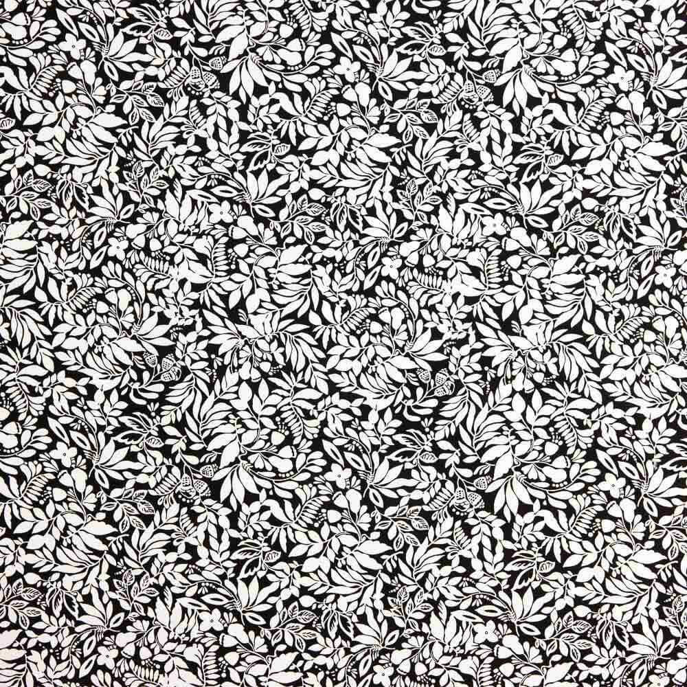 Tela de Viscosa estampada hojas bicolor negro. Viscosa estampada con caída, muy fluida y ligera.
