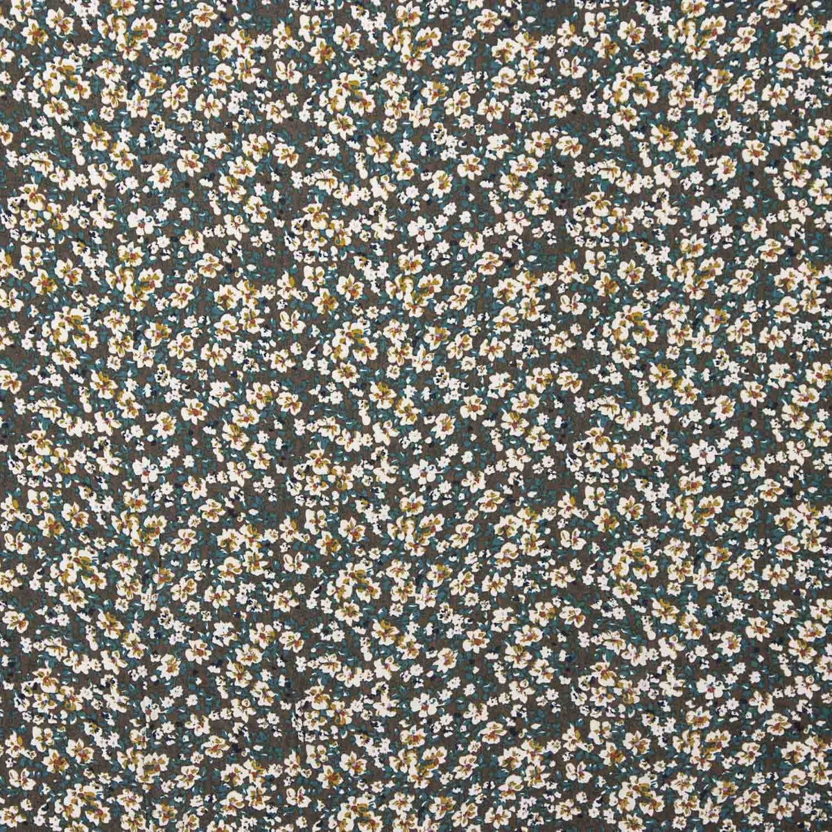 Tela de viscosa 100% estampada en figuras de flor sobre un fondo oscuro, perfecta para crear prendas ligeras y con un toque de frescura.