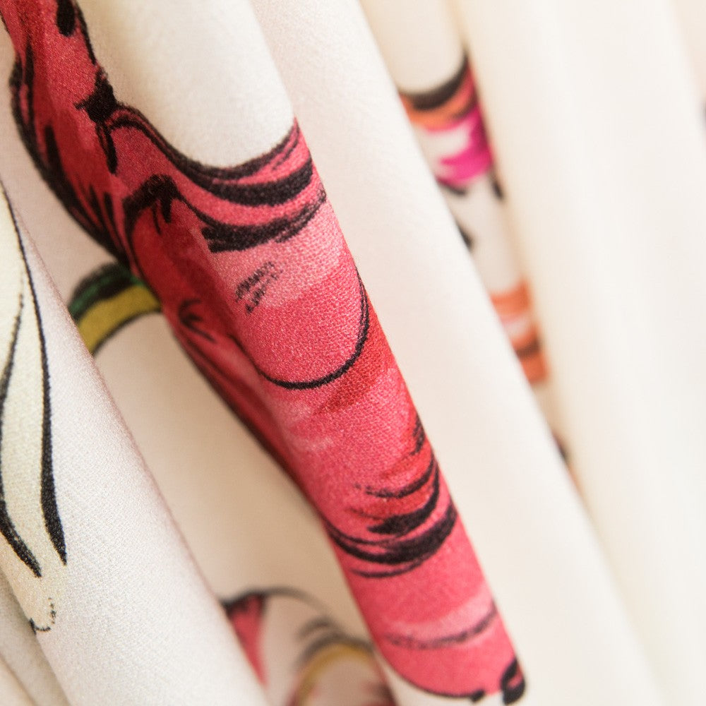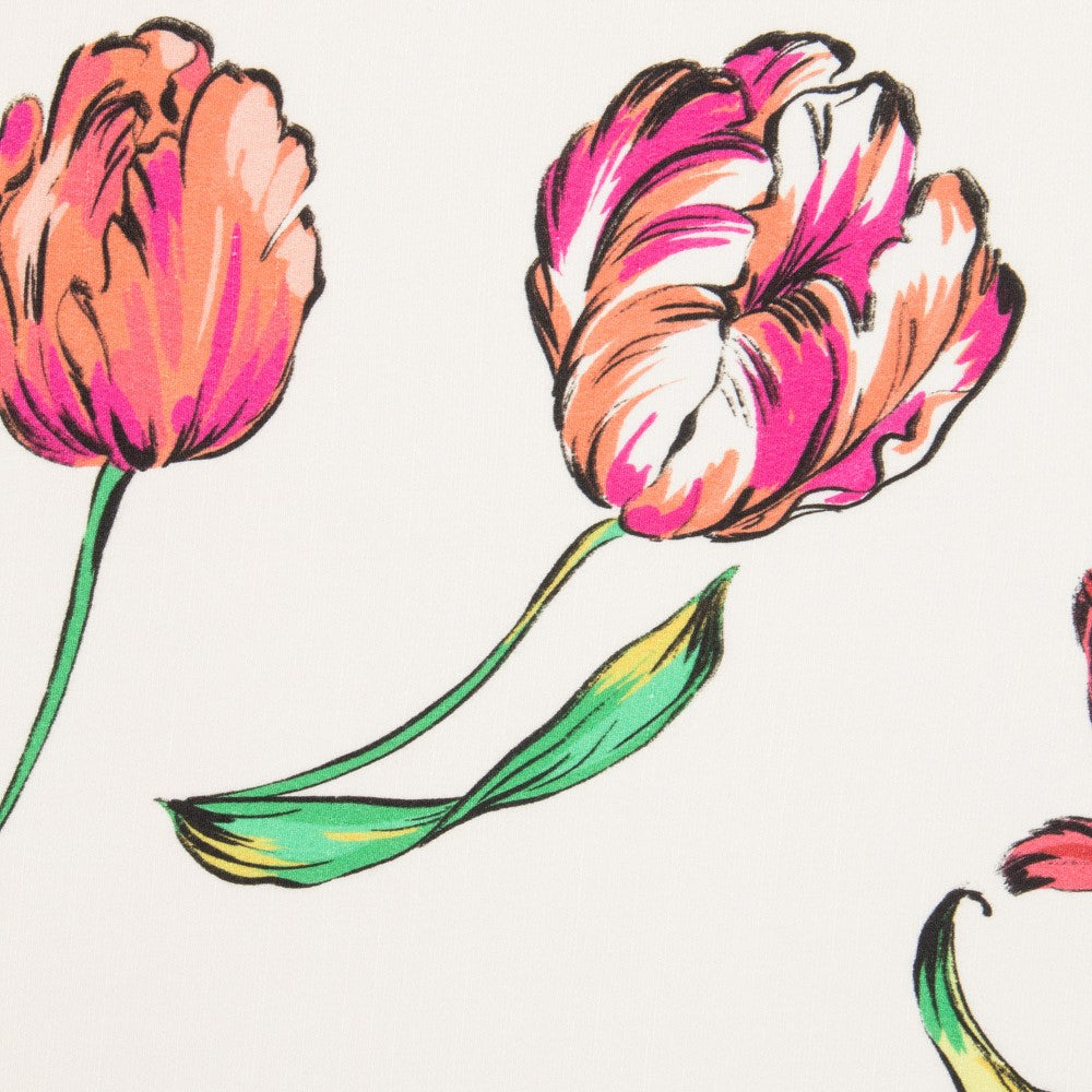 Tela de tulipán crudo, estampado para moda muy original. La característica principal de la viscosa es la gran sensación de comodidad, gracias al ser una tela fresca y transpirable. No acumula electricidad estática y es muy absorbente. Tela estampada ideal para confeccionar vestidos, faldas, pantalones y camisas.