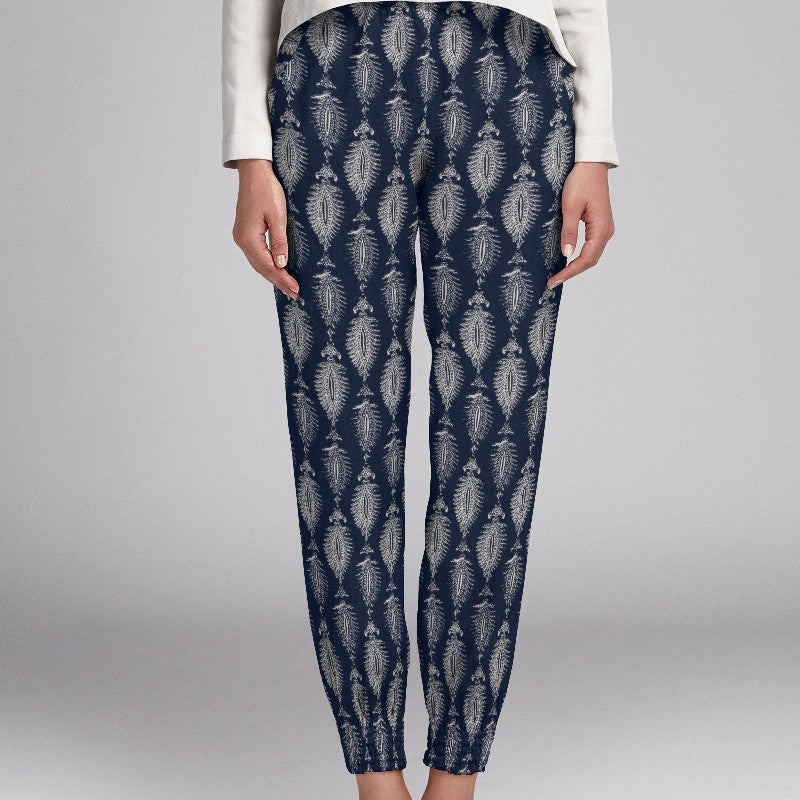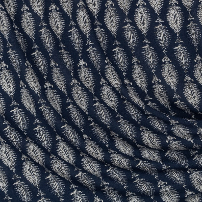 Tela viscosa con estampado de motivos blancos sobre fondo azulón. Tela muy fluida, con caída y suave, ideal para confeccionar vestidos, faldas, camisas, kimonos y más.