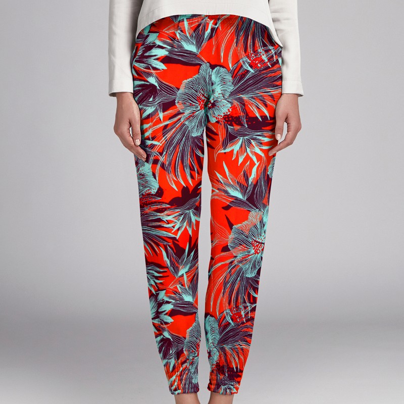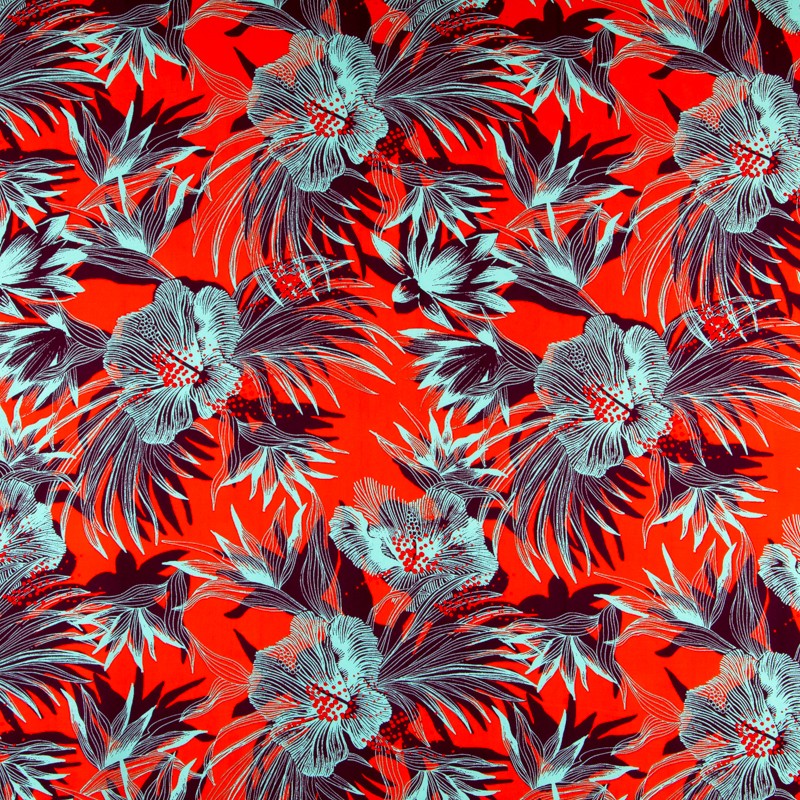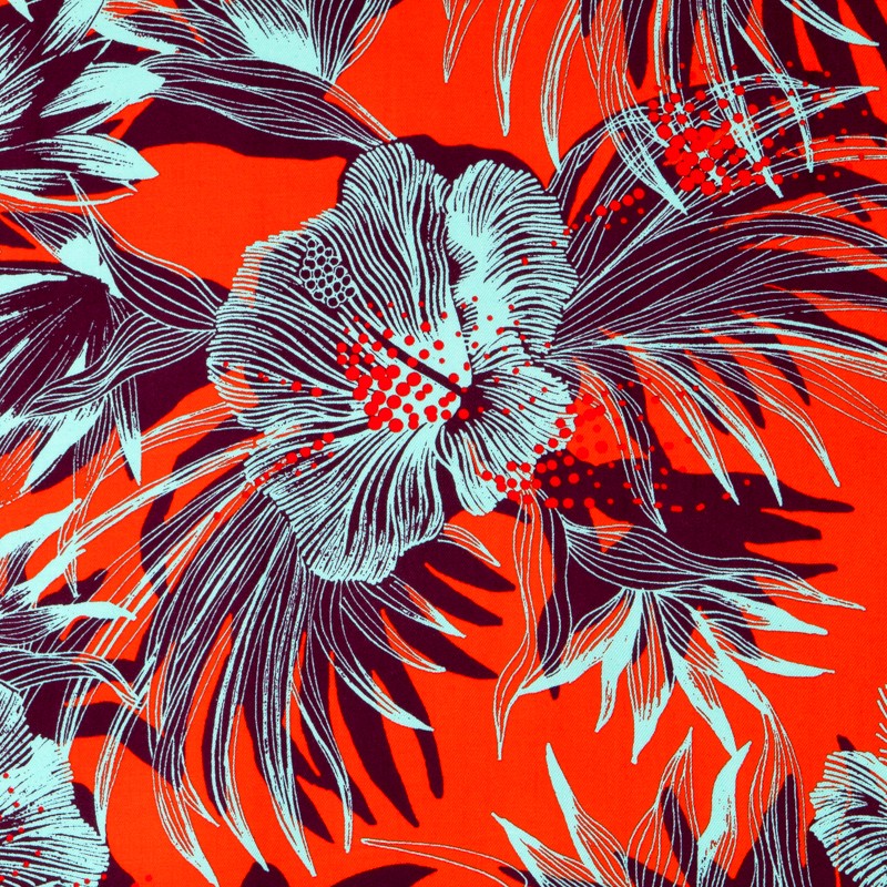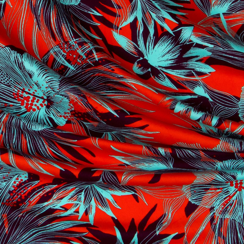 Tela de flores tropicales turquesas sobre una base de viscosa naranja intenso. La viscosa se caracteriza por ser una tela muy fluida, fina y muy suave. Tela online barata con la que puedes hacer todo tipo de vestidos para verano, camisas y faldas.