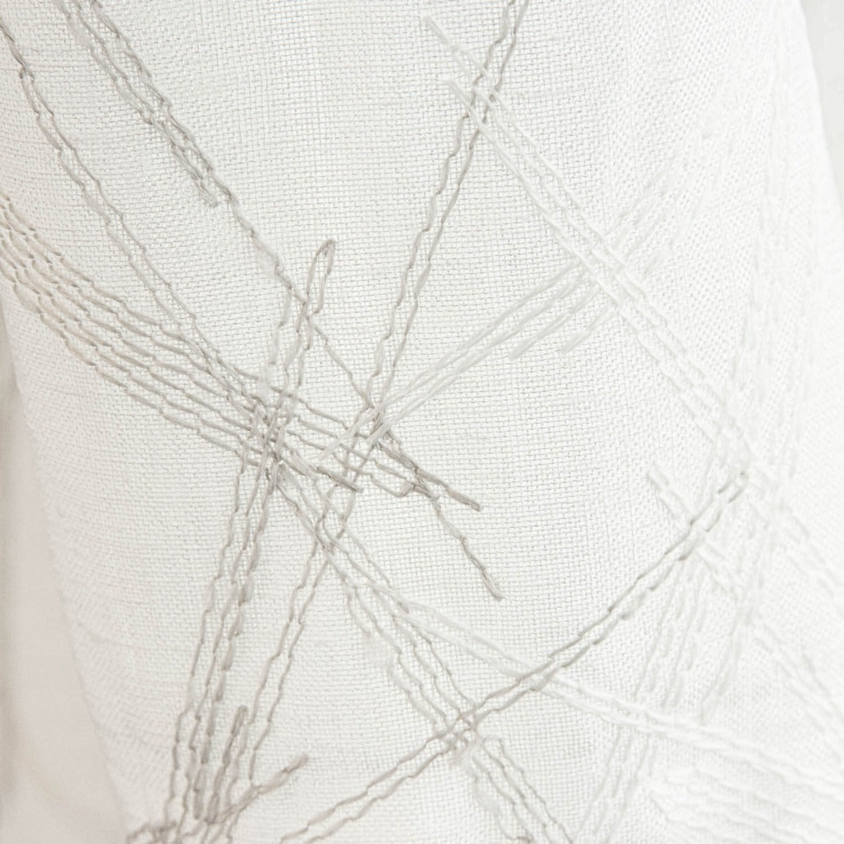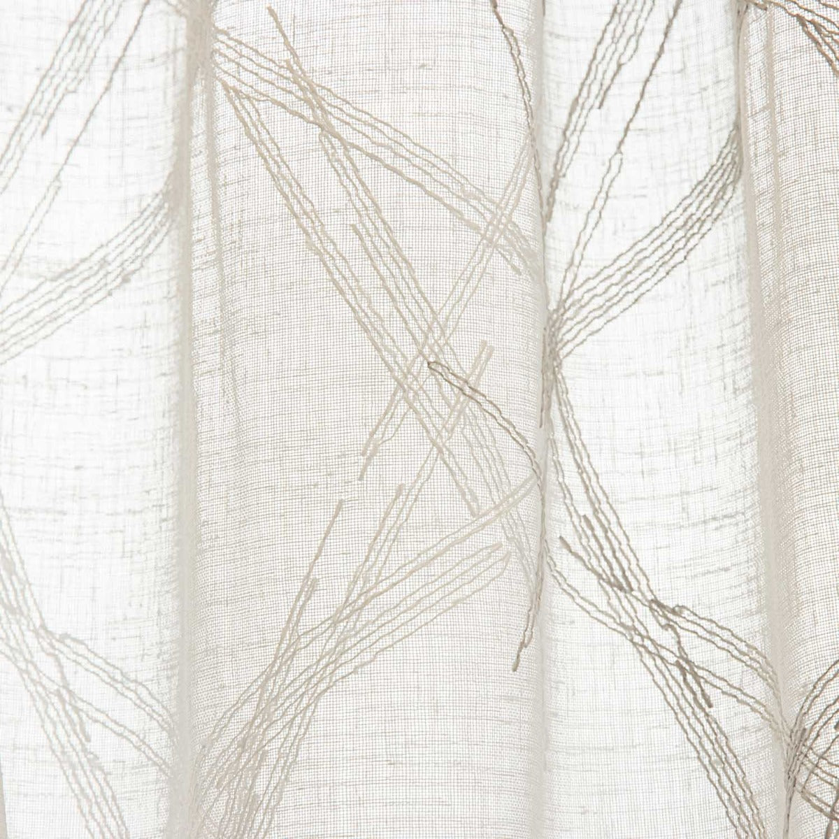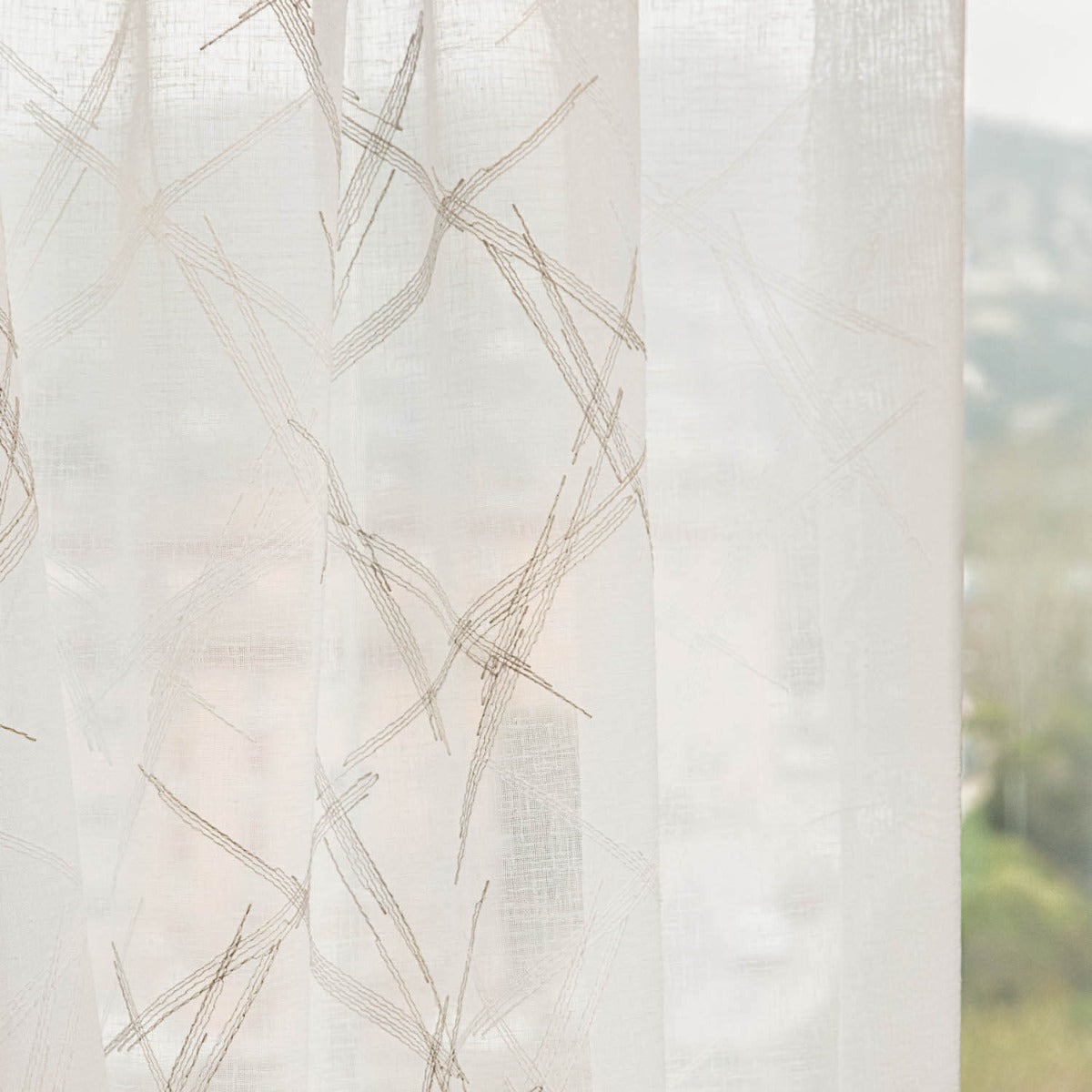 Tela de visillo a metros bordado trazos topo. Tela de poliéster 100% con una caida y un tacto esquisito con una altura de 280cm. Es una tela de visillo translúcida con buena caída para confección de cortinas. Debido a su composición, es un tejido de muy fácil mantenimiento. No encoje y puedes lavarla a máquina a 30º con un centrifugado suave. Si cuelgas las cortinas húmedas, con el propio peso quedarán perfectas sin necesidad de planchado. Se recomienda no utilizar suavizante. No admite secadora. La tela ya viene acabada en uno de los orillos del ancho con un cordón de plomo, que sirve de peso, listo para utilizar como final del bajo de tus visillos. para decoraciones de Hogar.