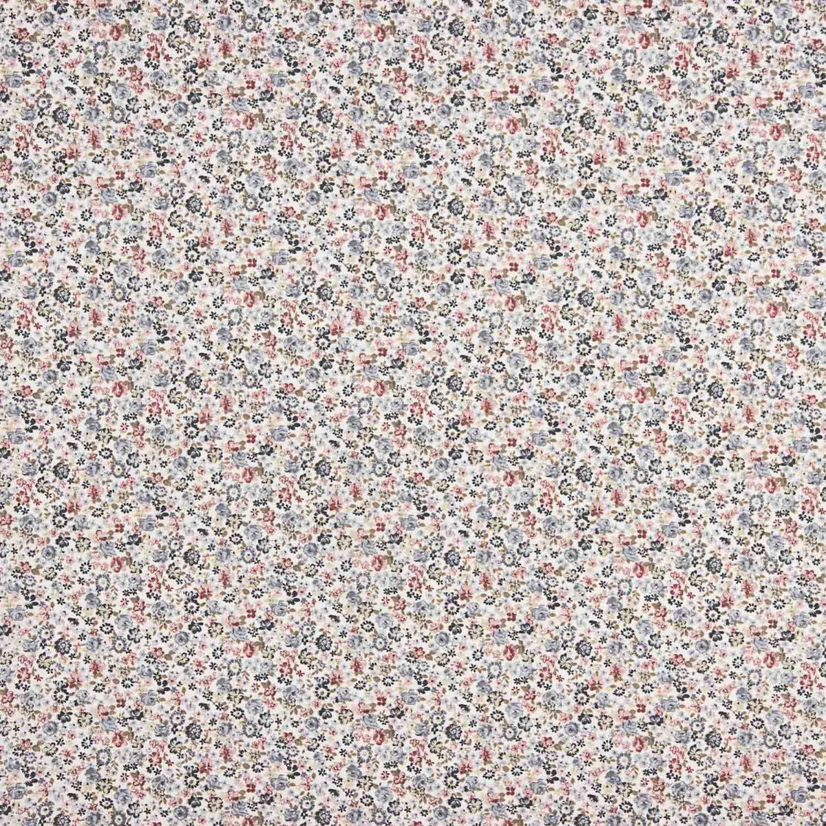 Tela de viyela de algodón de tacto suave y estampada de flores pequeñas que combina tonos azules, rosas y malva.