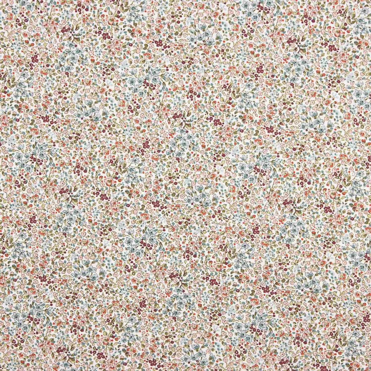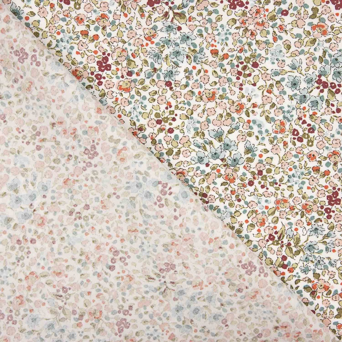 Tela de viyela de algodón de tacto suave y estampada de flores pequeñas que combina tonos rosados y verdes.
