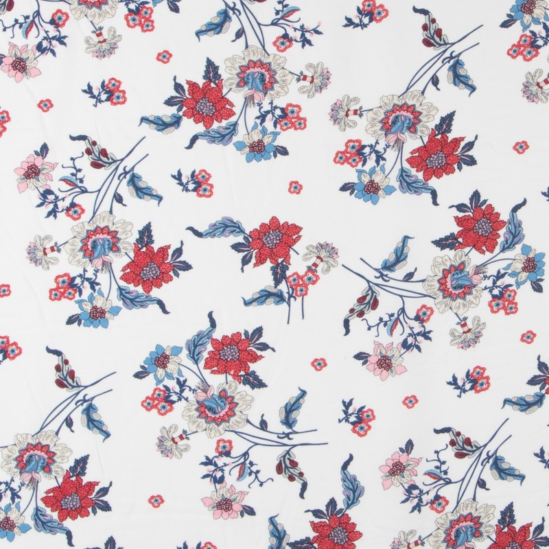 Tela de flores sobre una base de viscosa cruda similar al tramado de la viyela. La viscosa se caracteriza por ser una tela muy fluida, fina y muy suave. Tela online barata con la que puedes hacer todo tipo de vestidos para verano, camisas y faldas.