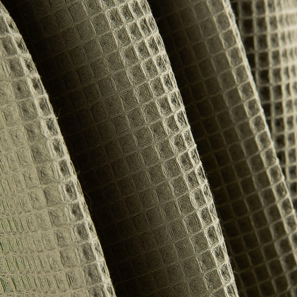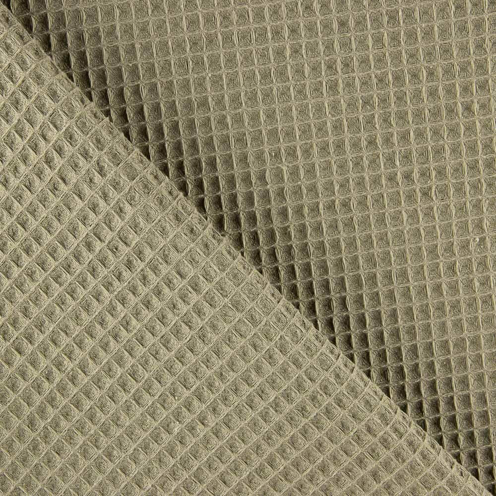 Tela piqué Waflle para hogar y bebé gris verdoso. Tela también conocida como toalla piqué, por los cuadraditos en relieve que componen el tejido. Tiene el cuerpo y peso ideal para colchas de verano, arrullos y complementos para bebé. Tela muy dulce debido a su composición de algodón, pudiéndose utilizar como saco de carritos para bebé y colcha de verano.